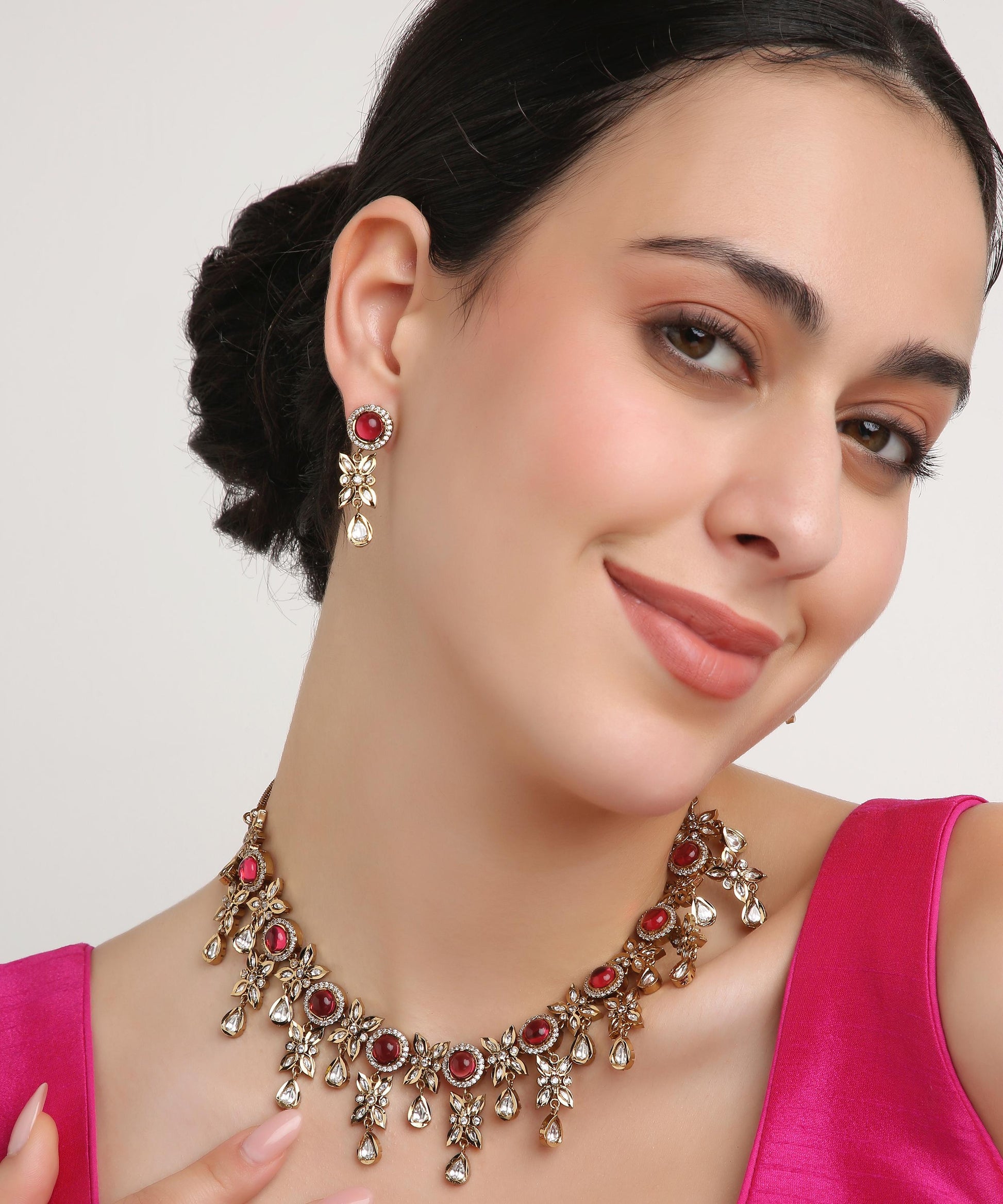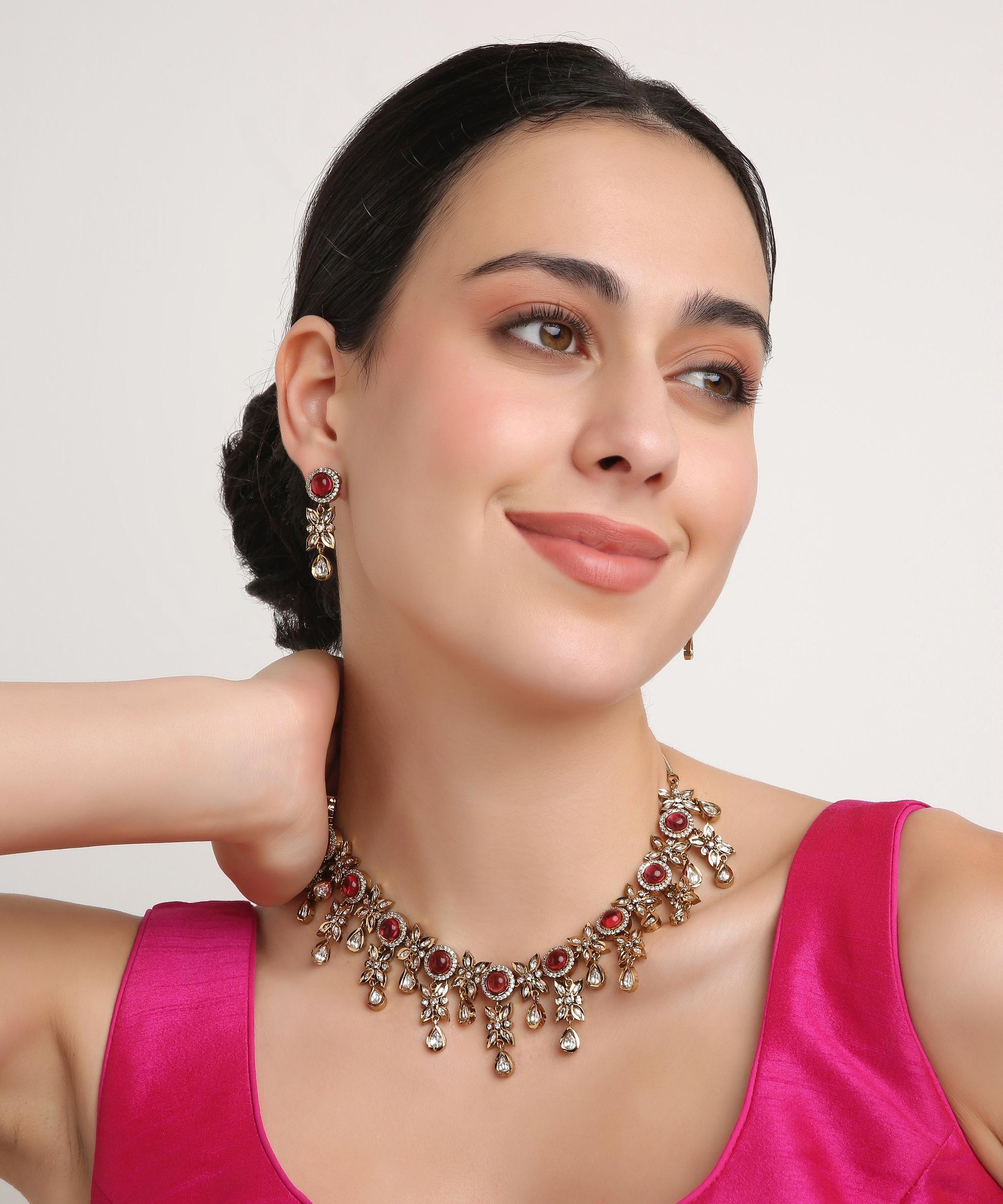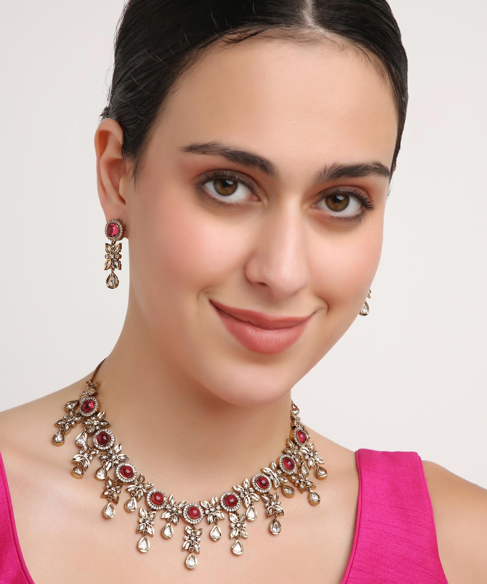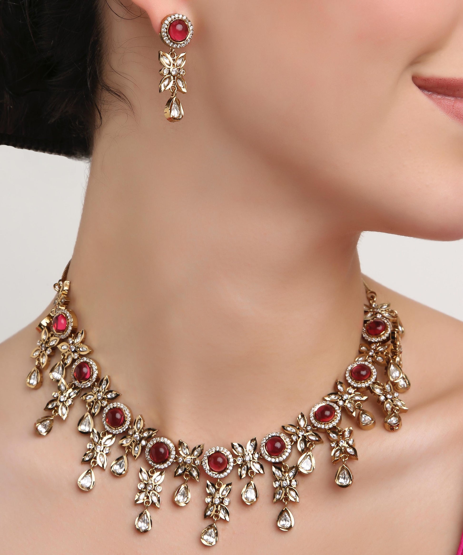 Step into elegance with this rose-gold floral necklace, delicately designed with blooming flowers and sparkling kundans. Its soft blush tones and intricate detailing make it perfect for parties, festive occasions, and weddings, adding a romantic charm to your look.